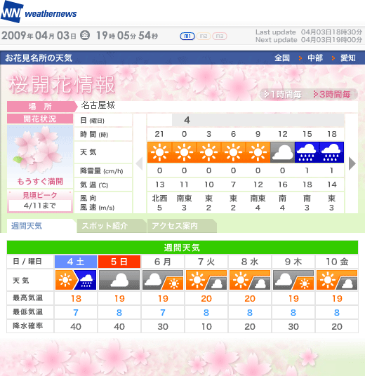 2009/04/03 AM 02:45 ウェザーニュース社のサイトにて名古屋城の桜開花情報を入手。