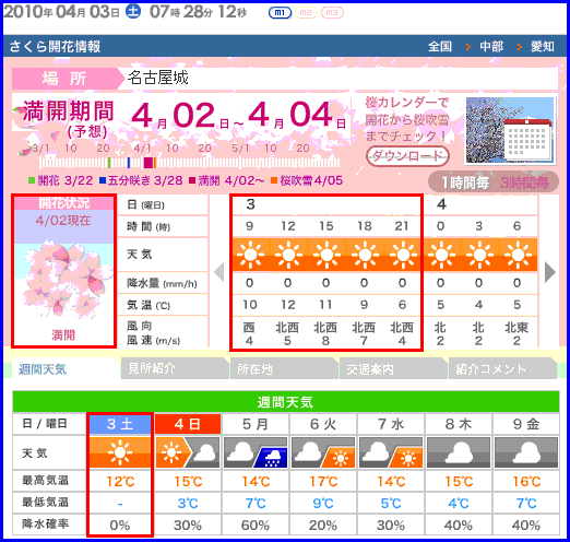 2010/03/31 AM 08:25 現時点でのウェザーニュース社による名古屋城の桜開花予報を見ると、予想満開期間は4/1〜4/4。4/3当日は満開真っ盛り!さらに、天気も晴れそうです!